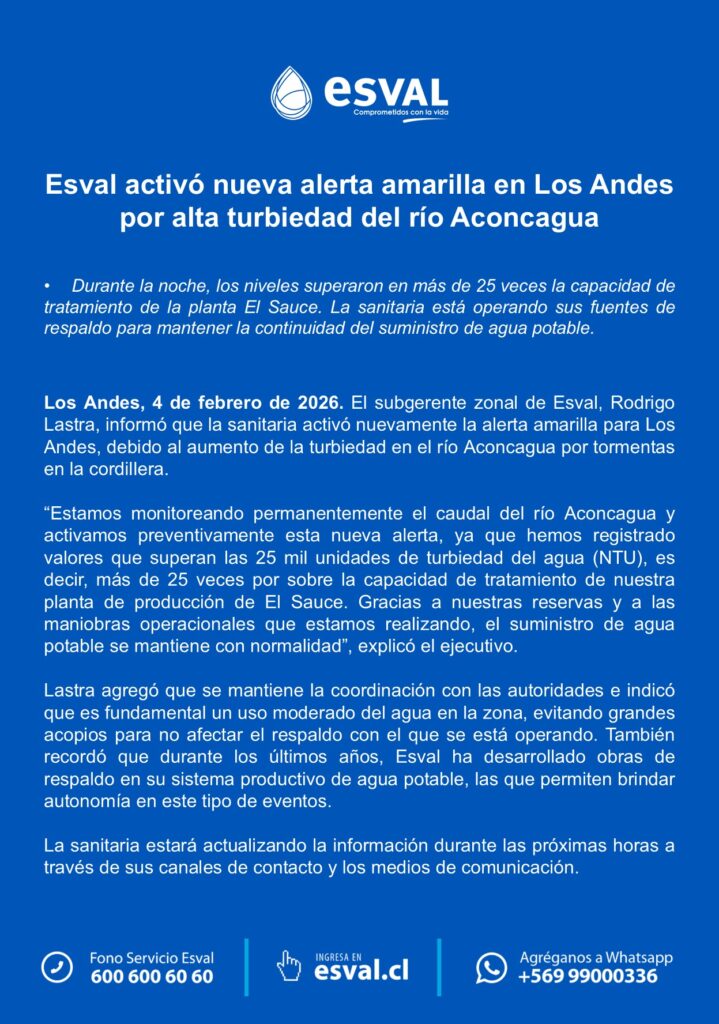 ESVAL ACTIVA NUEVA ALERTA AMARILLA EN LOS ANDES POR AUMENTO DE TURBIEDAD EN RÍO ACONCAGUA.-